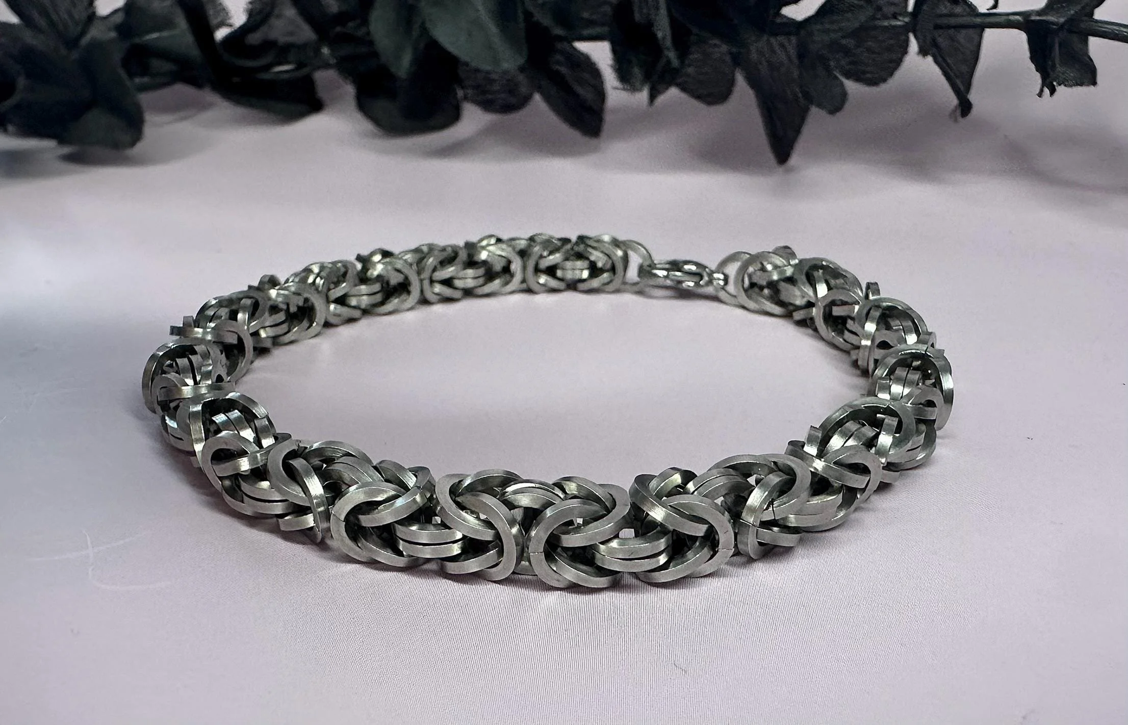 Square stainless steel rings are handwoven one by one to create the classic weave, Byzantine. The intricate pattern of the Byzantine weave creates a timeless, elegant design that is both bold and sophisticated. It dates back to the 16th Century with multiple uses and one of them being jewelry.
